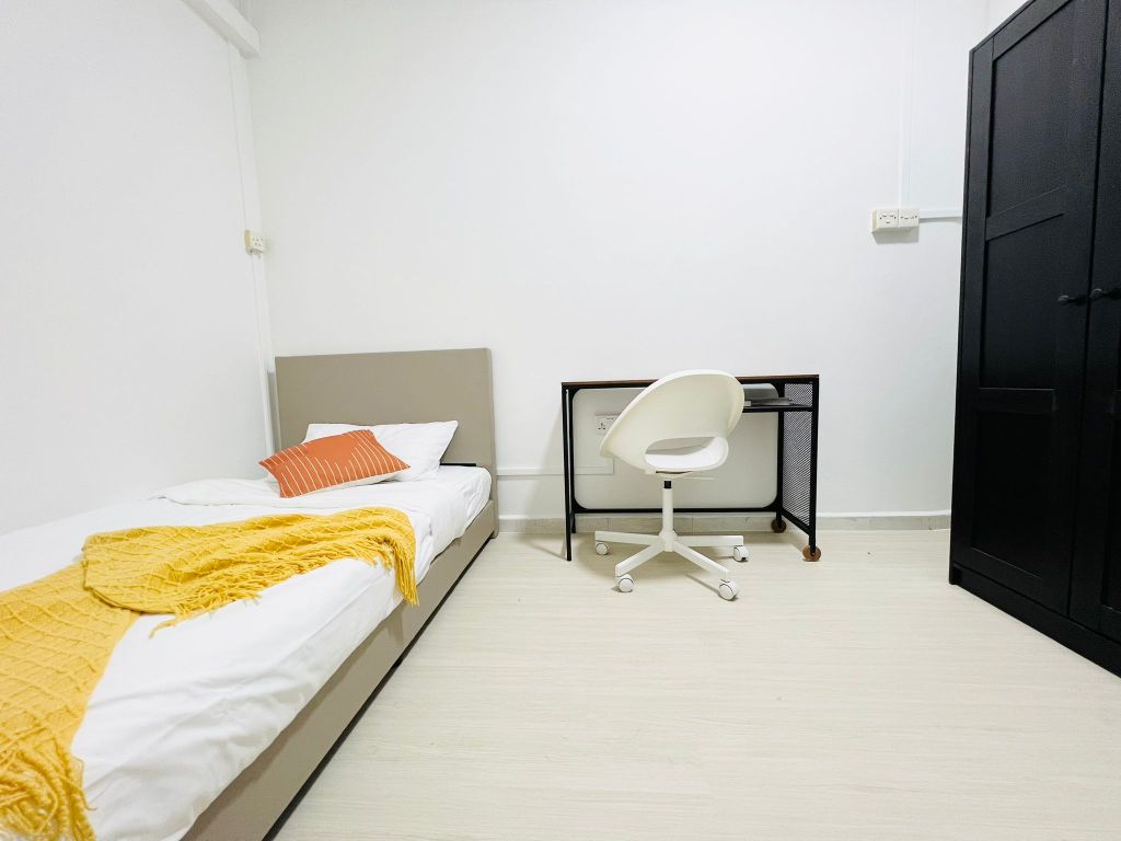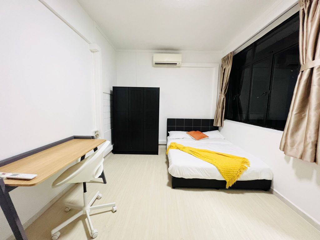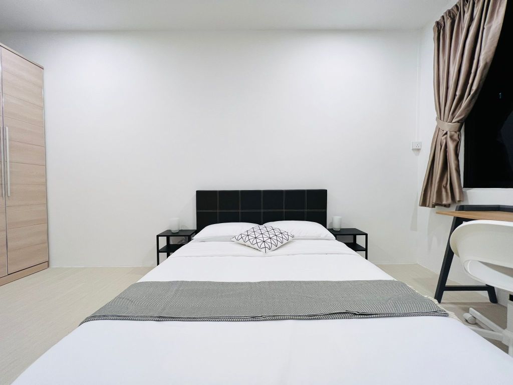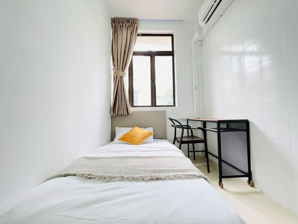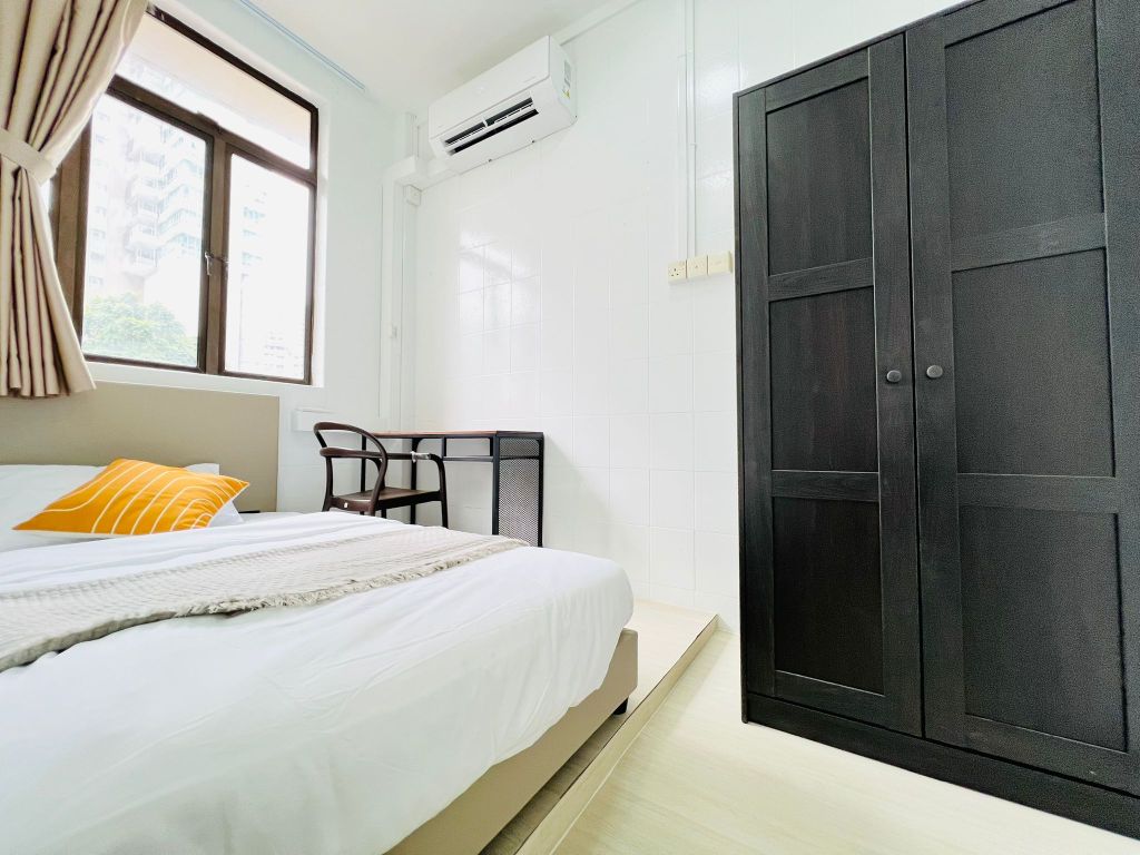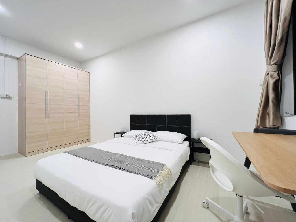 Your private room equipped with aircon, workstation, queen bed and 3-door wardrobe. A large window at the end of the room brings in natural light in the day, and has a night curtain to block out unwanted light when you are sleeping.