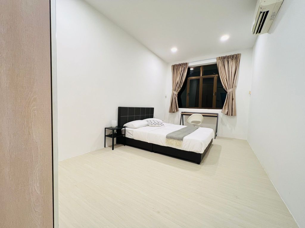 Our largest ensuite room with a small tub to take off the stress at the end of the day. Fully equipped with aircon, workstation, queen bed and 3-door wardrobe. Sufficient space to even bring in some of your own furniture!